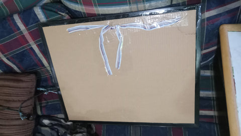 This item is used in the condition shown. It was purchased years ago. The cardboard hanger in the back is broken and replaced with tape and ribbon as shown. The frame is made of plastic.